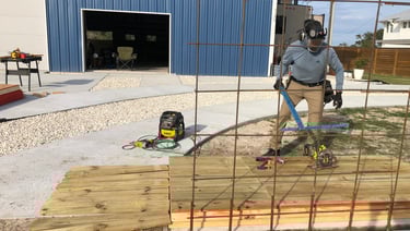 We also picked up some light-colored rocks in the past month that we dropped into place between the finished concrete. Pay no attention to the alien in the space suit, trying out his new mask.