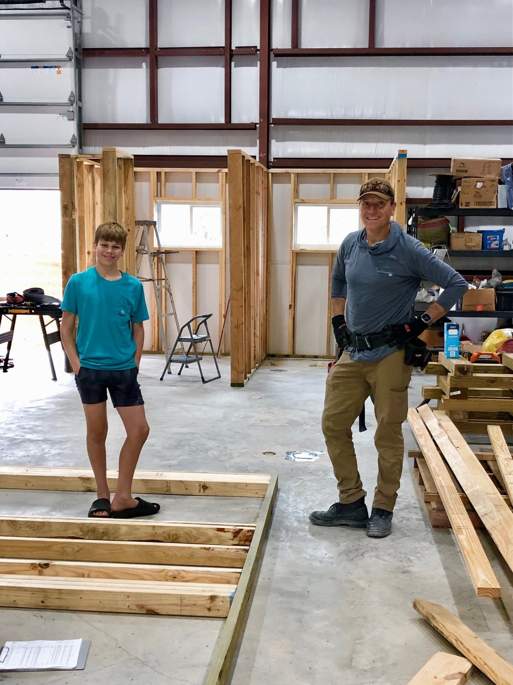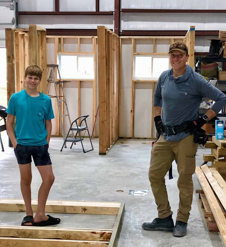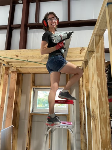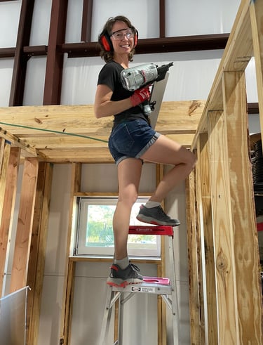 We framed the laundry room and bathroom in the barndo (the cat’s hulls will straddle the massing), and it has ceiling joists and subfloor now: