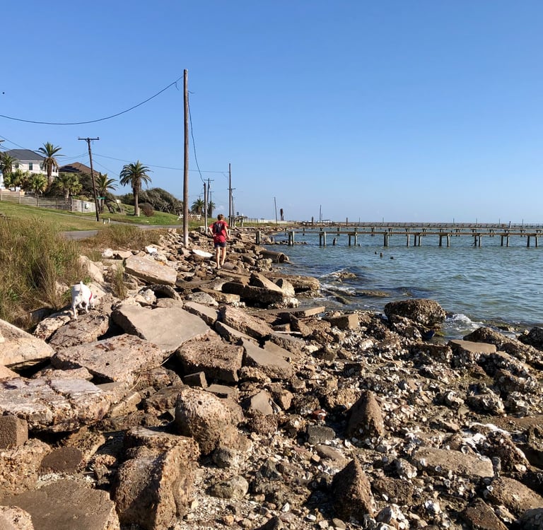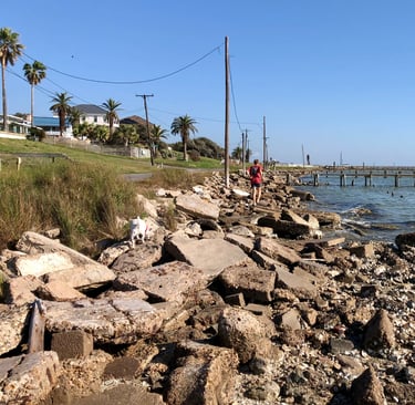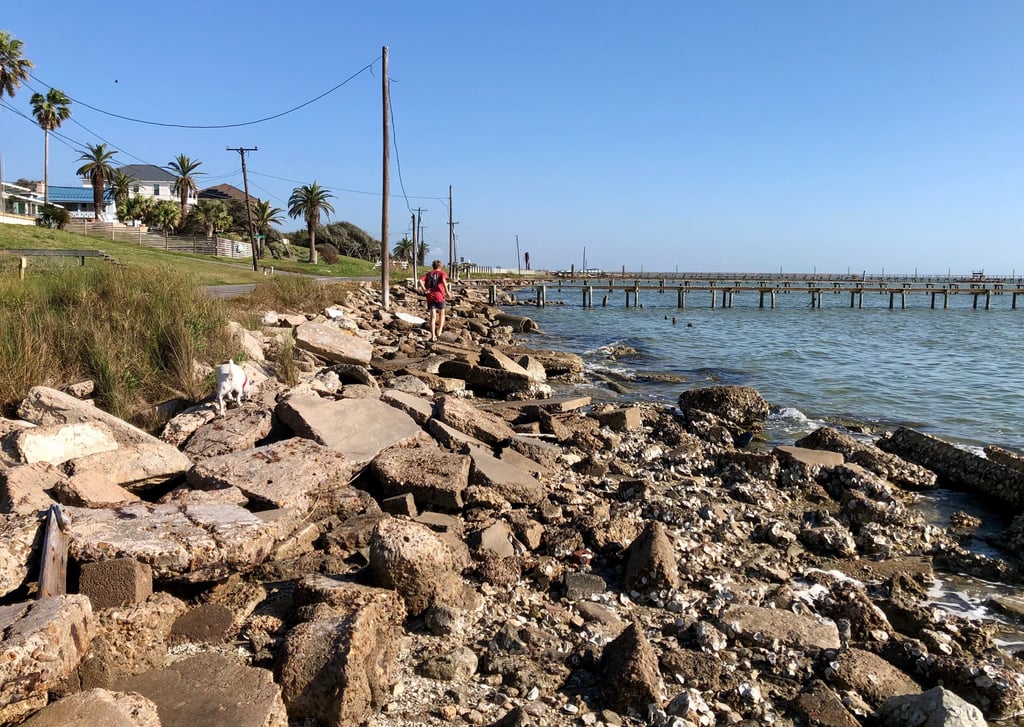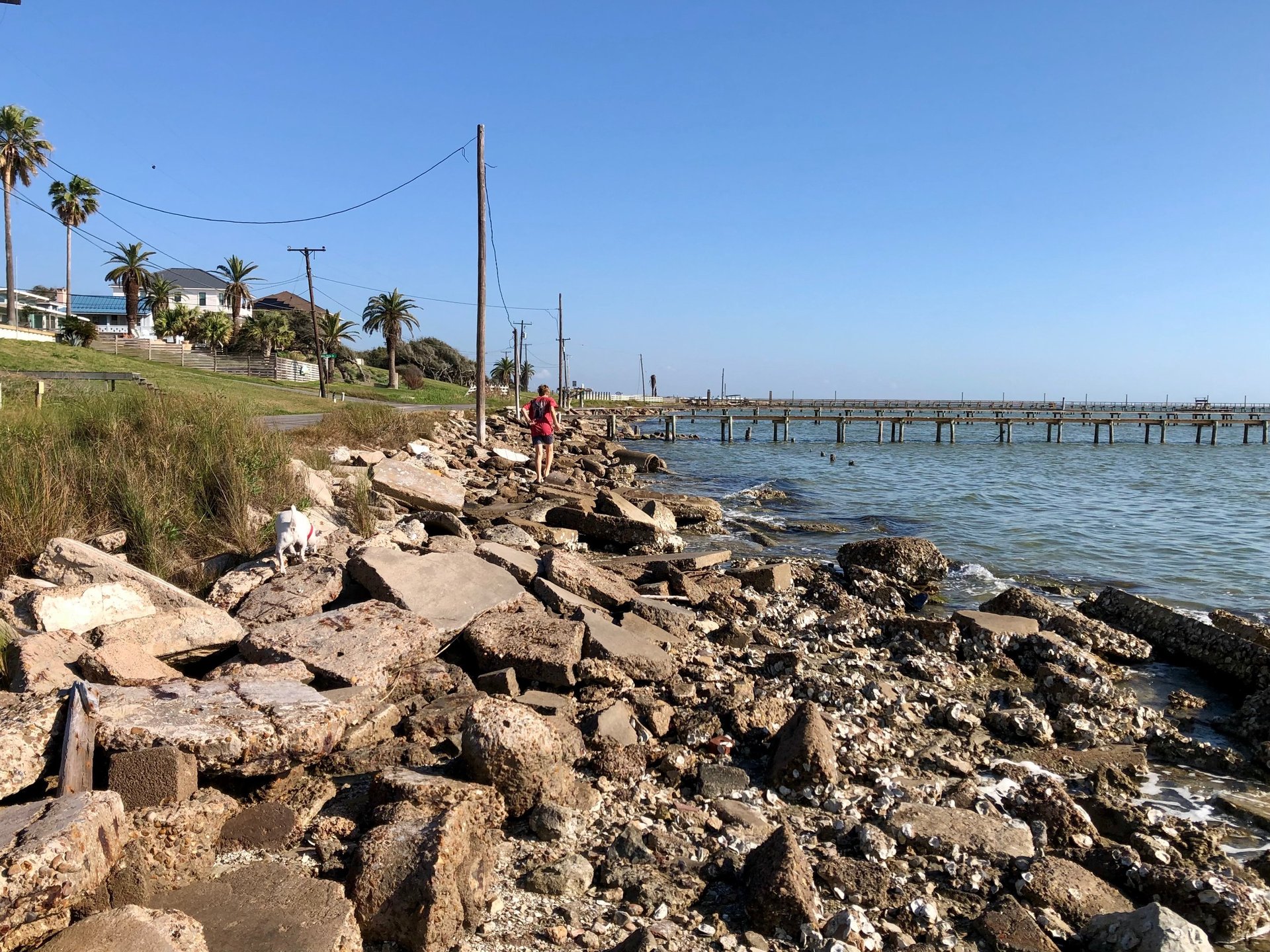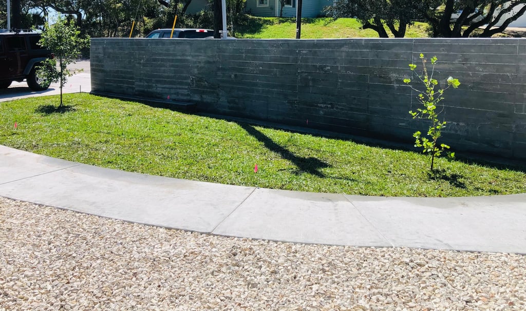 We finished laying rock along the sides and back of the house, then went to Victoria to pick up four pallets of sod in Victoria. We ate outside at a lovely restaurant called the PumpHouse overlooking the Guadalupe River, then drove home and laid most of the sod until it was dark-thirty. (Mar 27):