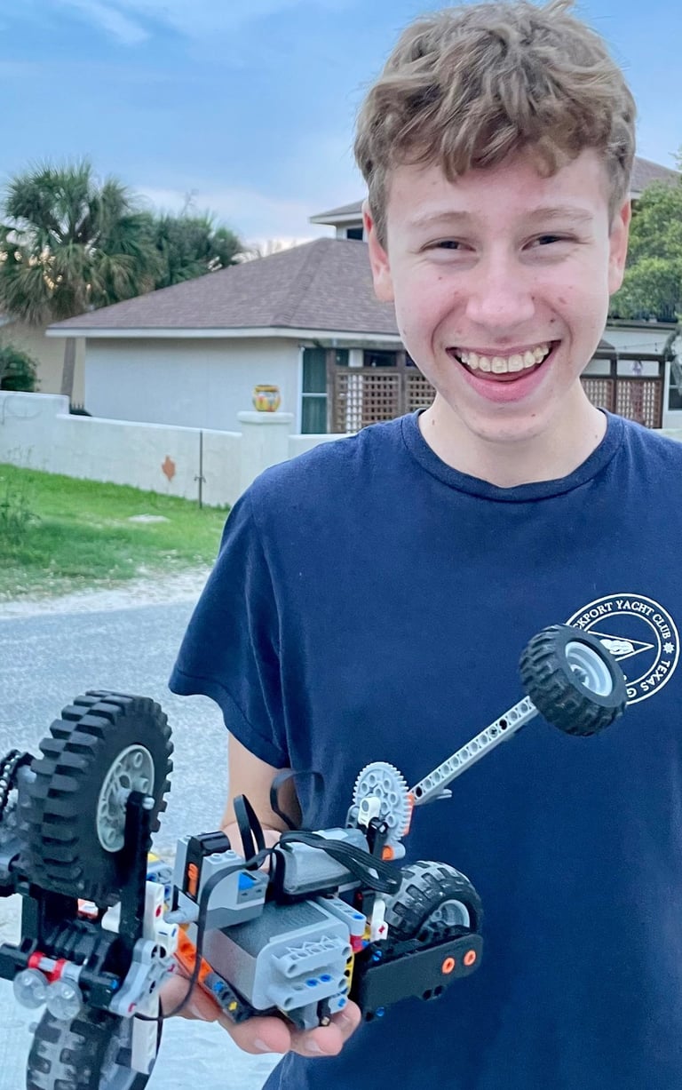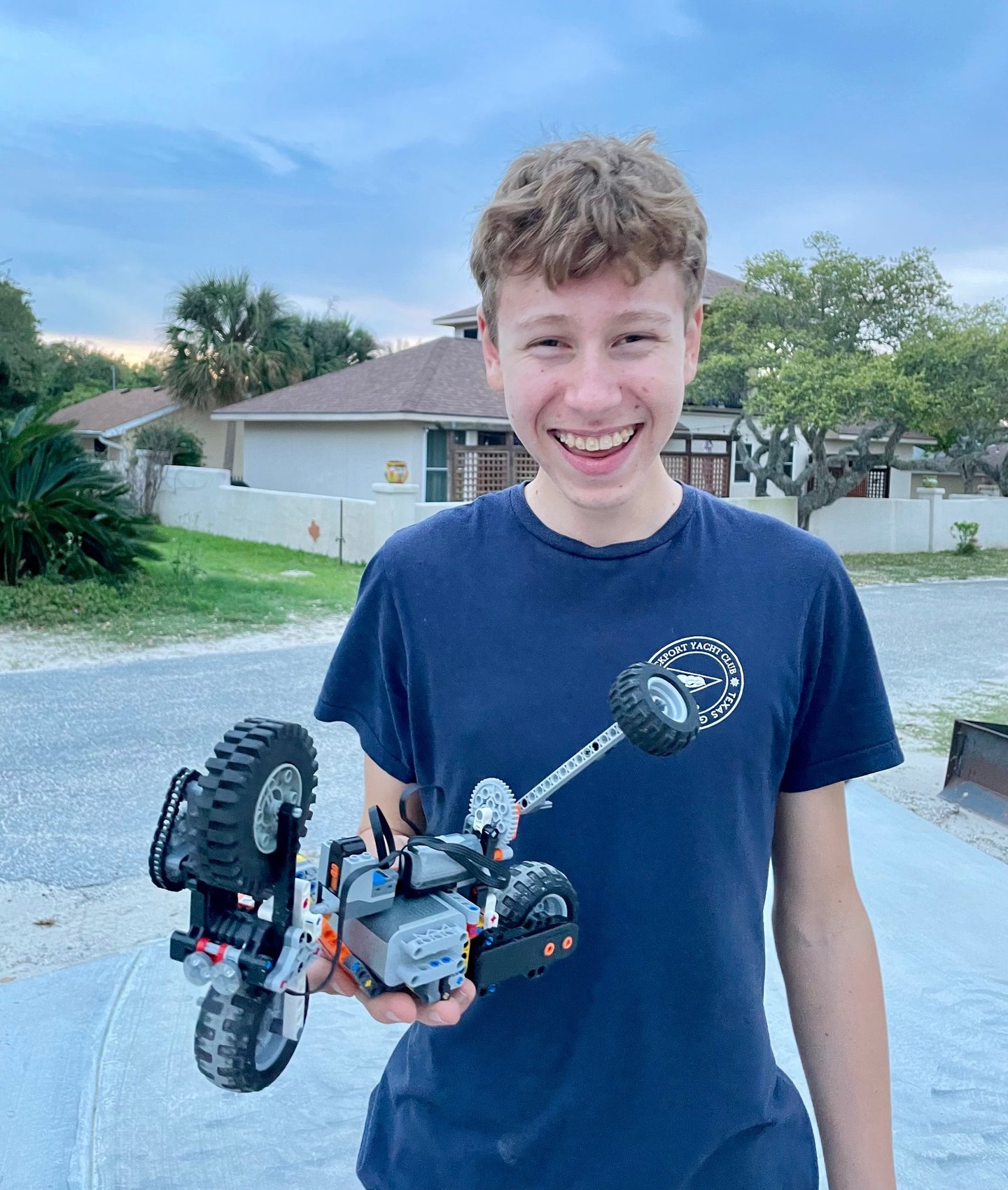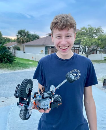 In some of Tristan’s spare time, he designed a remote control Lego gyroscopic motorcycle that works really well, but he's now working on one that can go even slower without falling over: