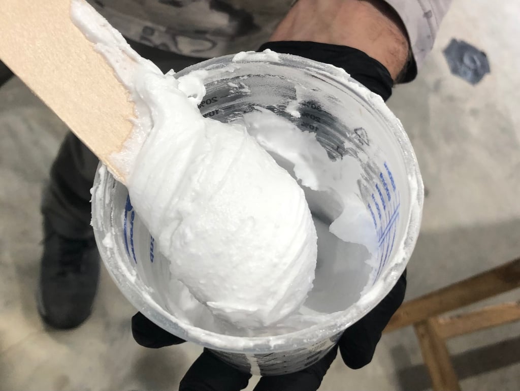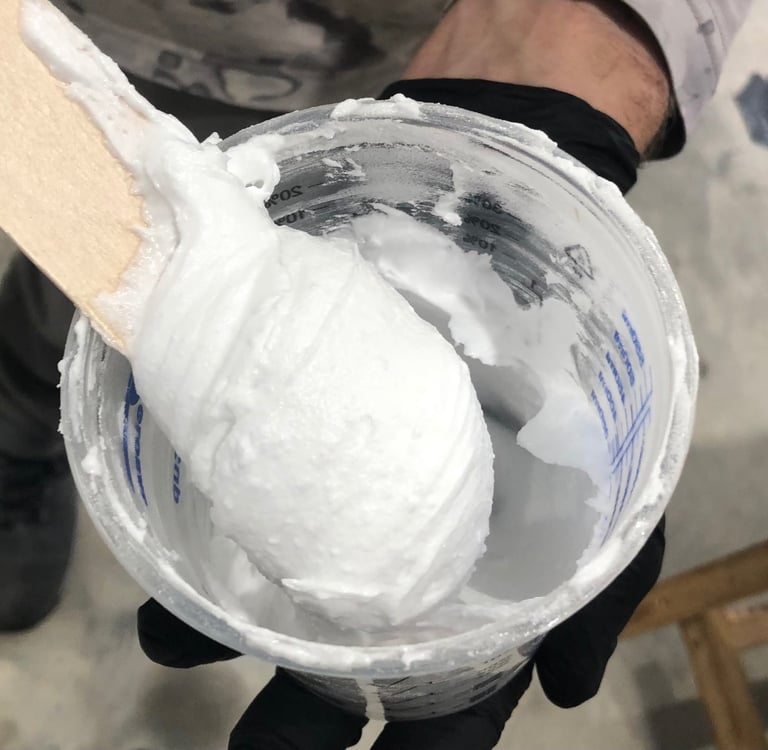 My job, for the most part, was using the scale to measure out a ratio of resin and hardener (fast- or slow-curing), plus possibly some cotton flock fiber (for structural integrity), microspheres (for ease of sanding), and/or fumed silica (for thickening and strength). Anyone want some melted “marshmallow” on a stick?