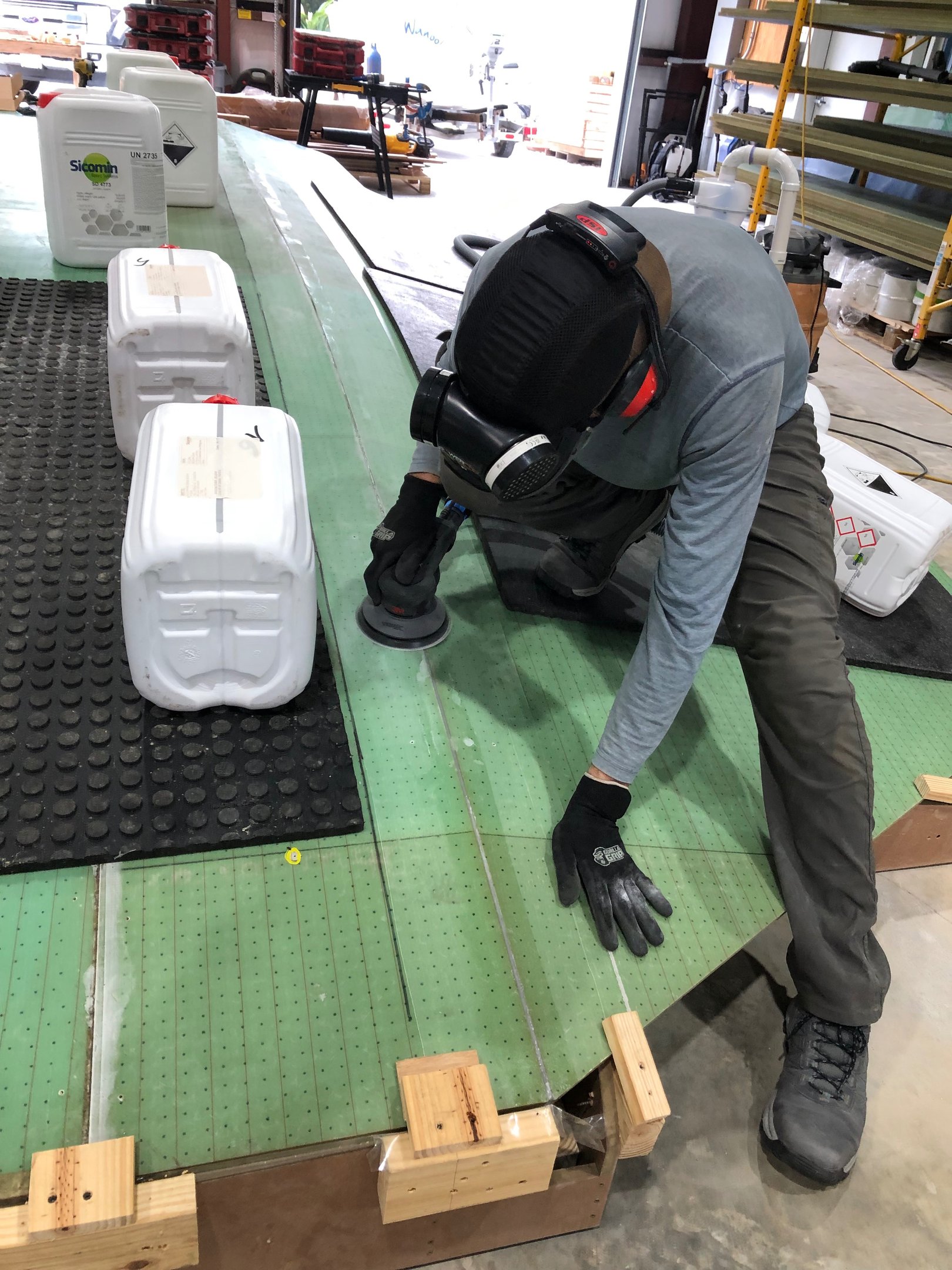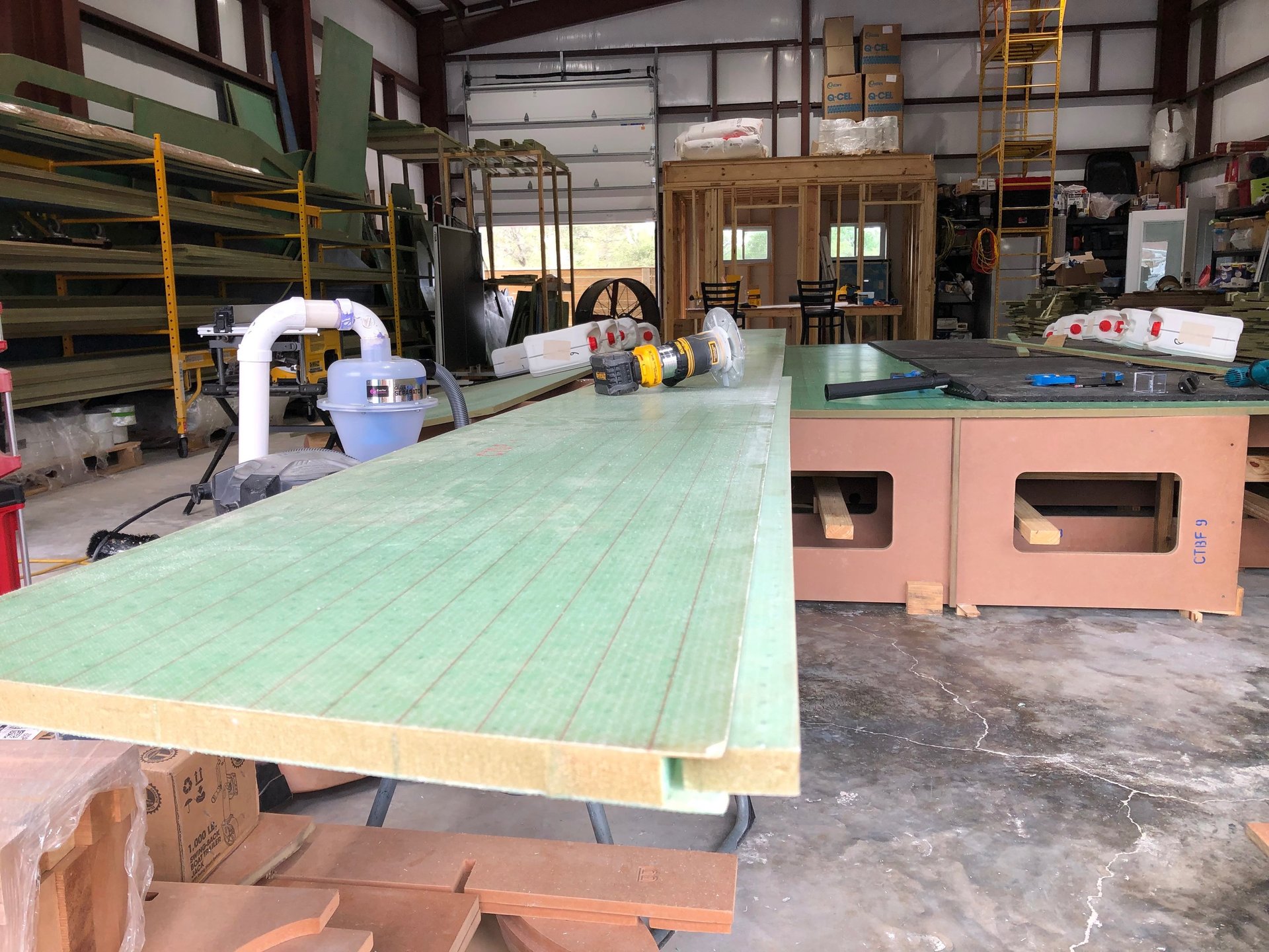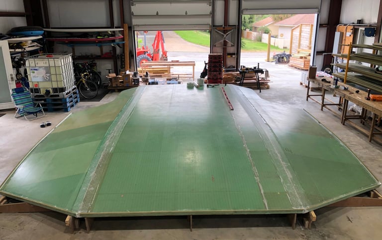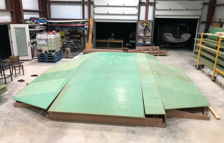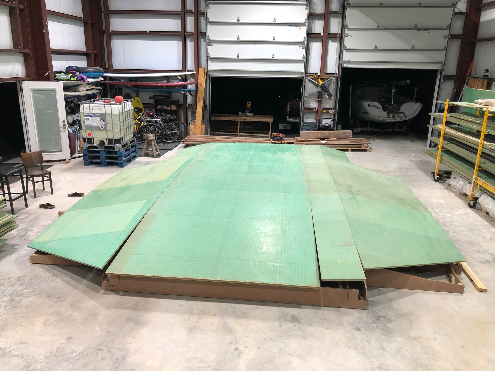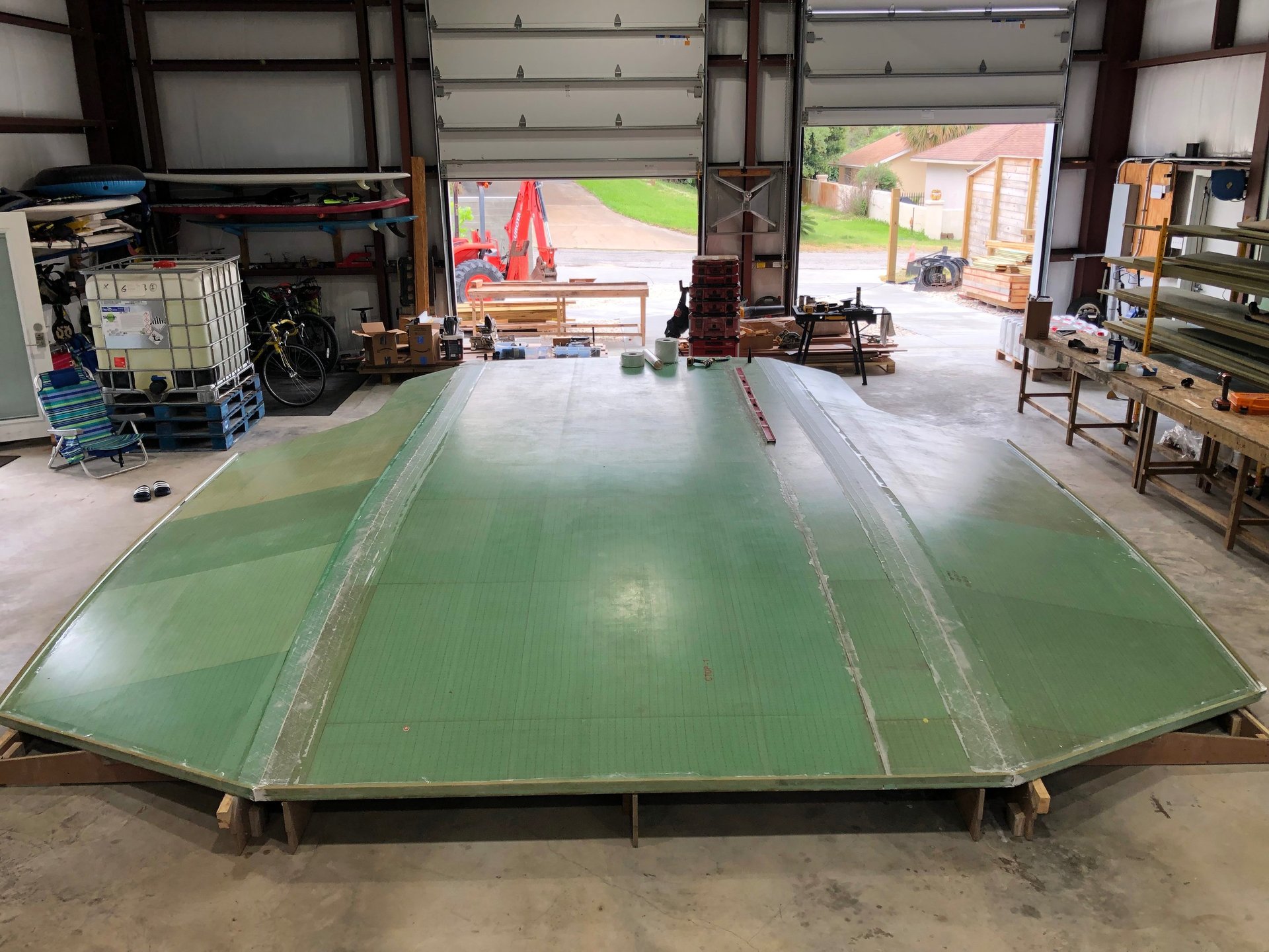 Next up, we’re waiting on two electric hoists to come in the mail so we can raise it, flip it, and glue the underside!