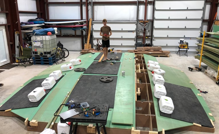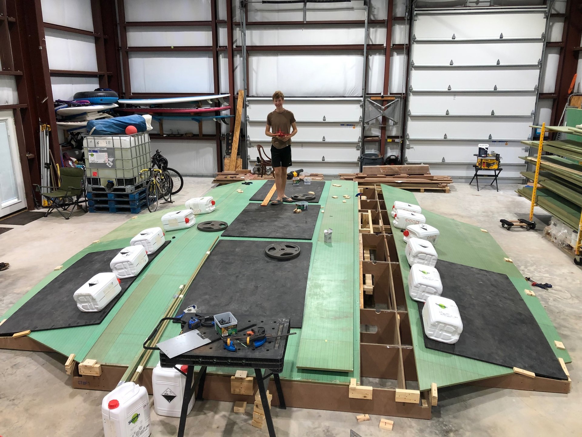 Tristan helped place the edge of the roof, which will act as a grip while walking along the boat and also as rainwater collection.