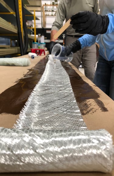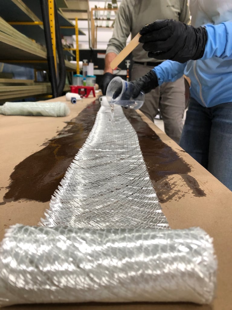 We pre-wetted out some fiberglass strips by brushing resin over them on butcher paper, and then we painted more resin on top of the strips when they were in place.