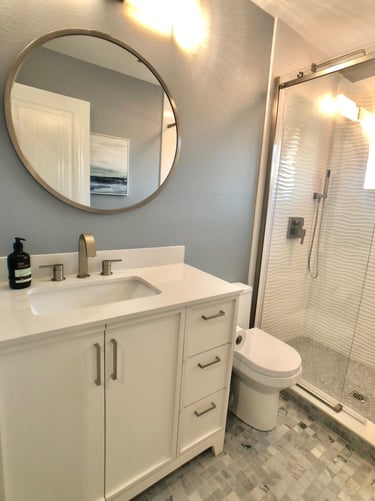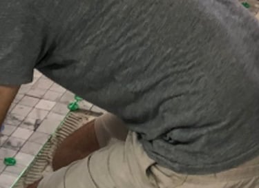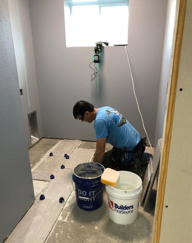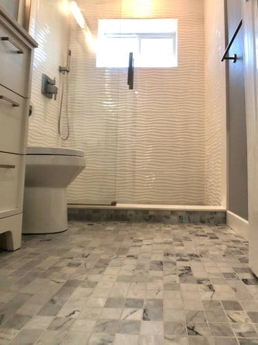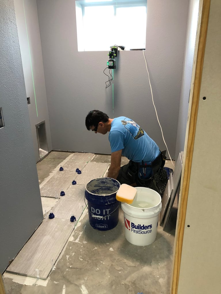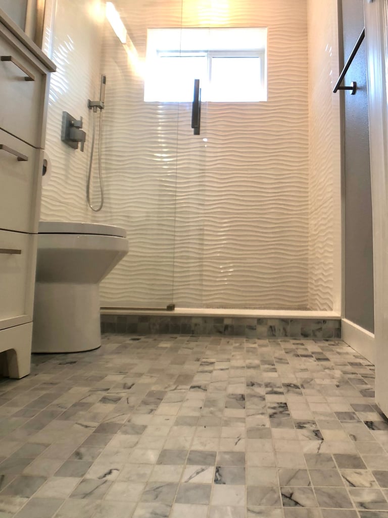 The bathroom was quite a bit more time consuming, considering there were many more tiles, and the waves in the shower tiles needed to be lined up, so it required my full attention to which sides I should cut. Nick also had to stay laser-focused: