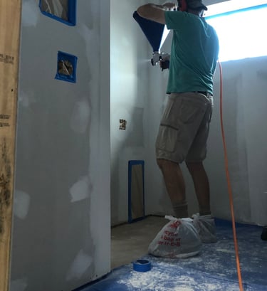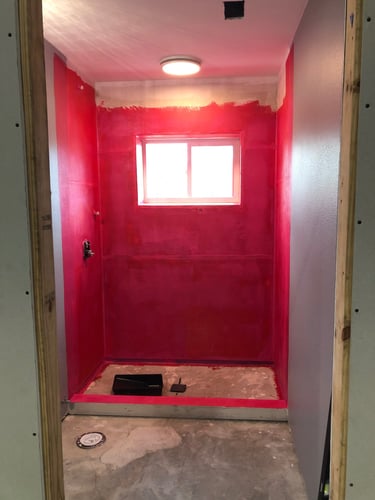 Since the last time I posted, we got busy finishing the barndo’s laundry room and bathroom. One of the first things Nick did was texturize the sheetrock before we could paint, and he waterproofed the shower with a passionate pink that will never see the light of day.