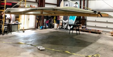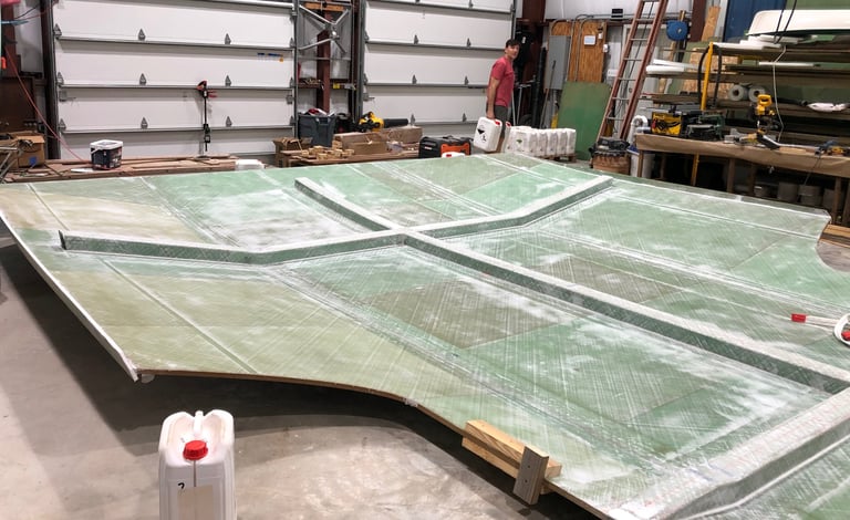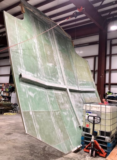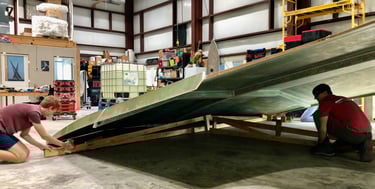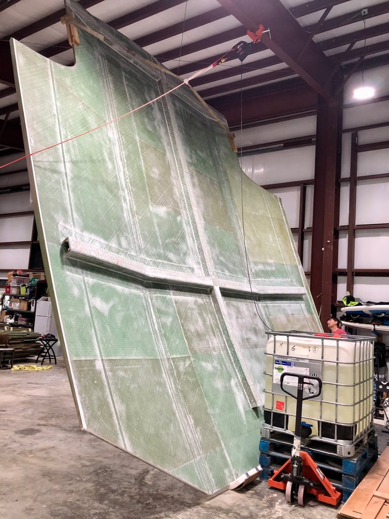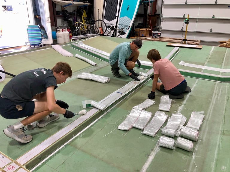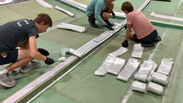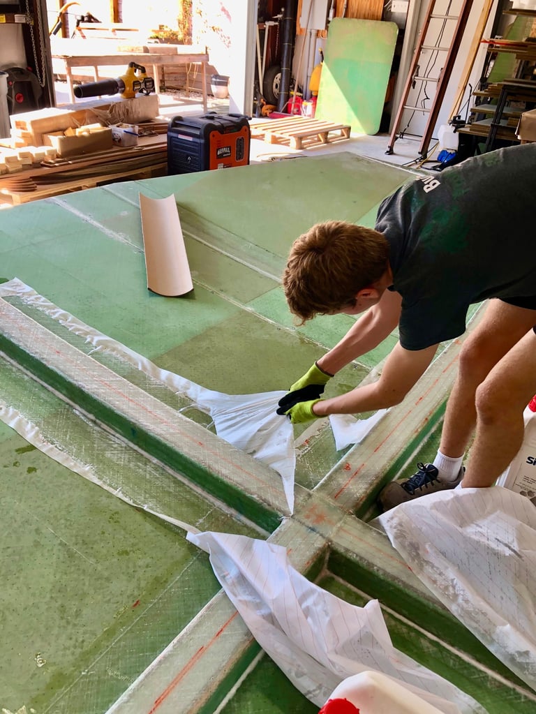 We laid peel ply on top of the epoxy while it was still wet so the beams would have a smoother surface. The next day, Tristan had fun pulling the fabric off.