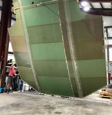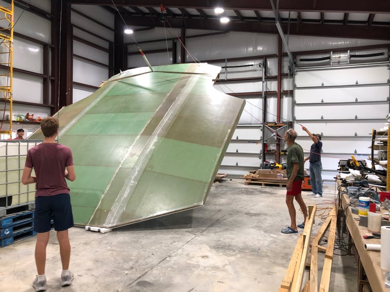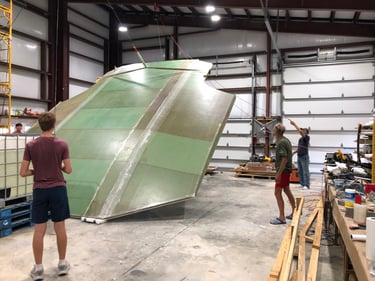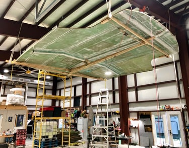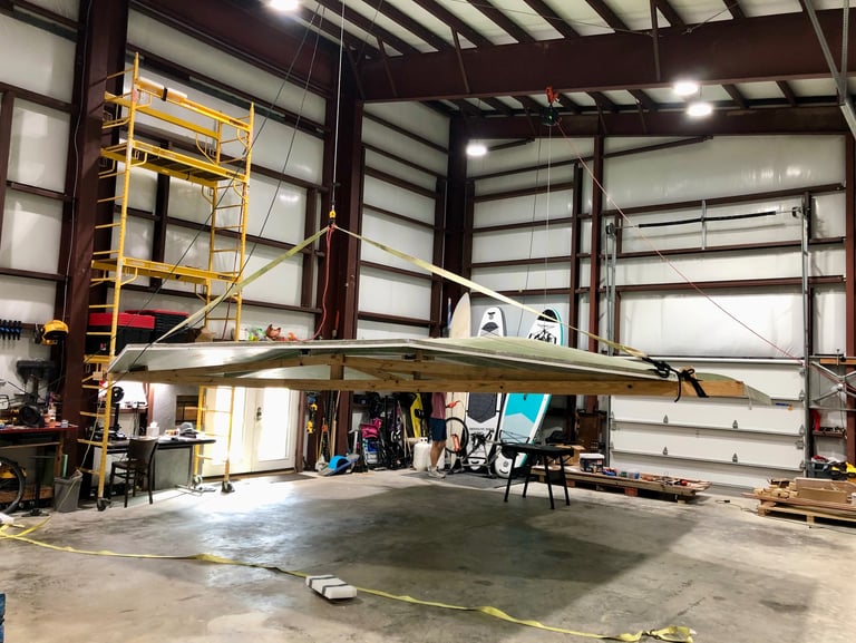 Finally, the roof was pretty enough to be flipped and hung out of the way so we’d have room to build the rest of the boat. For minimal damage from the straps, Nick secured wood blocking to the narrower part of the roof (that will overhang the stern cockpit).