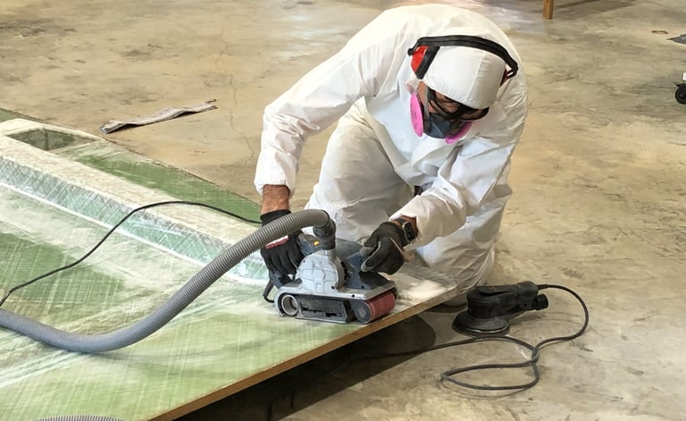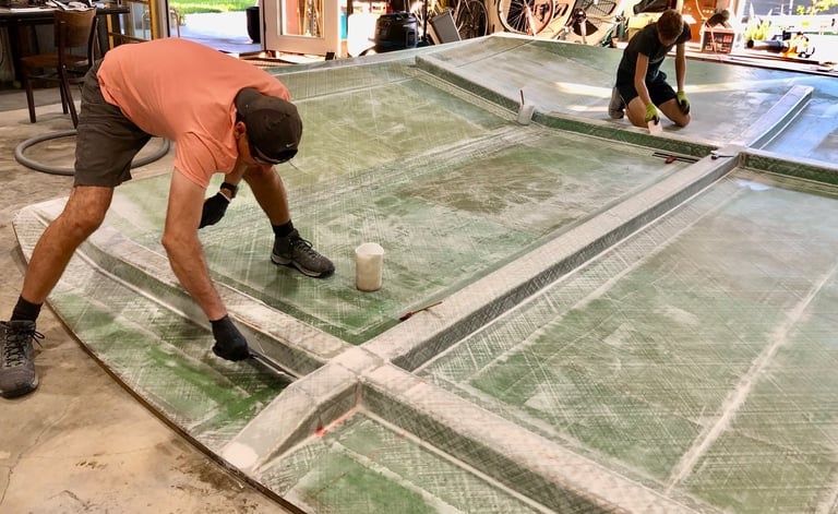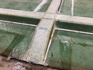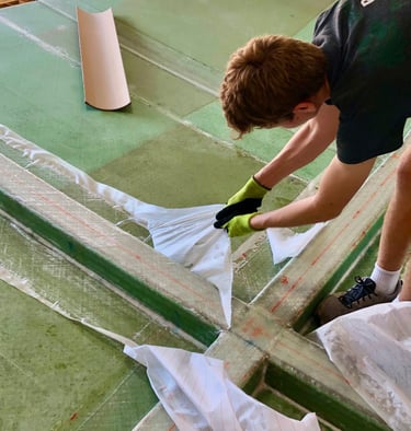 It was time for epoxy—and lots of it! My experience in baking and chemistry classes came in handy as I painstakingly measured and mixed up numerous batches for the beams’ fiberglass overlays. I kept the batches coming for the cute, hardworking guys on the roof.