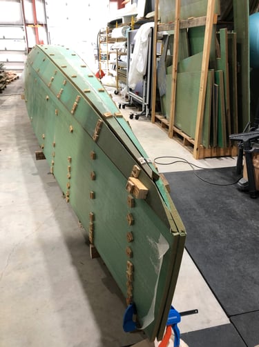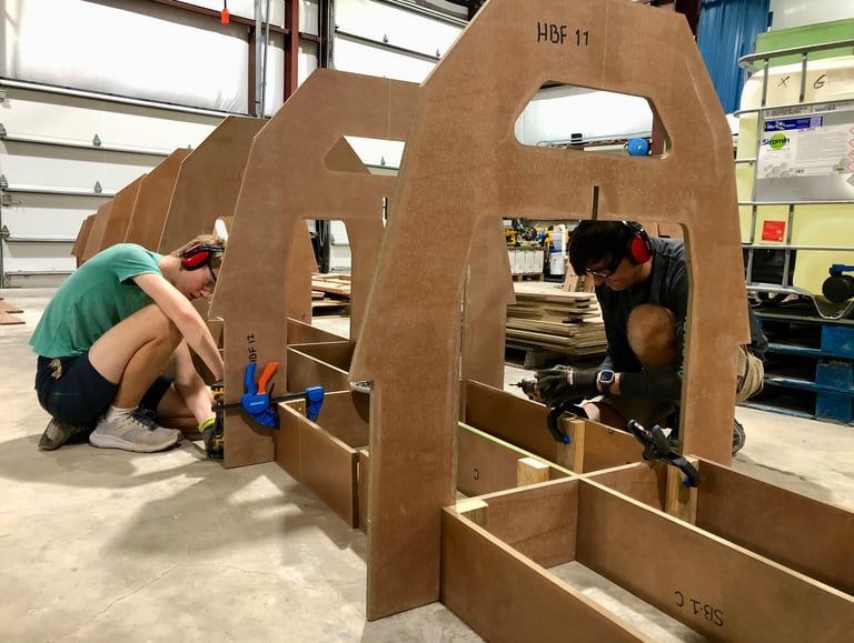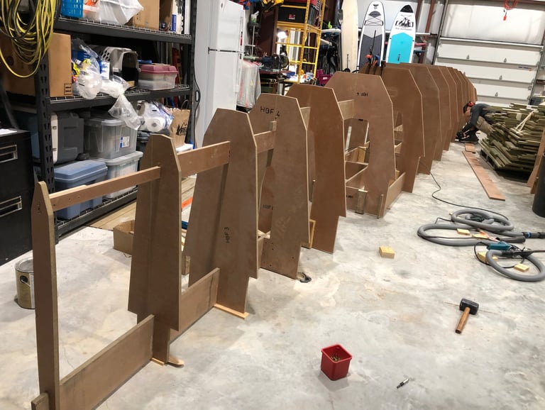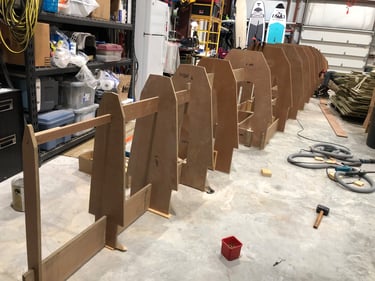 Before Thanksgiving 2024, we put together the provided temporary forms that would enable us to shape the bottom of the two hulls. Thankfully, they came together fairly easily. Nick glued parts of the MDF to the concrete floor to keep the template from moving.