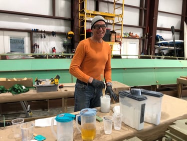 Next up: epoxy day (similar in excitement to concrete day)! We blended up what looked to be a perfect thickness of epoxy and filled the first hull’s holes. We don’t mind a holy hull, but a holey hull is unacceptable!