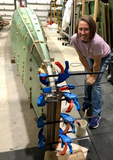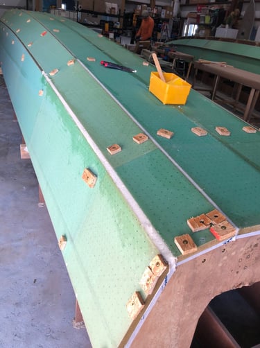 Since the panels of the 49-foot boat had to be divided in order to fit in the 40-foot shipping container, our next step was to glue the long hull pieces together. On December 5, we started placing our hull panels onto the MDF template.