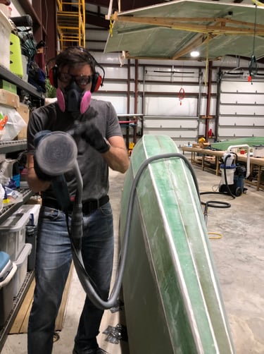 By December 22, I found Nick sanding since we had two hulls ready after a couple of epoxy passes per hull. En garde!