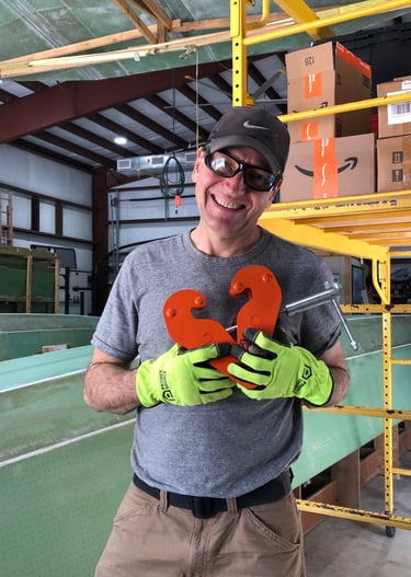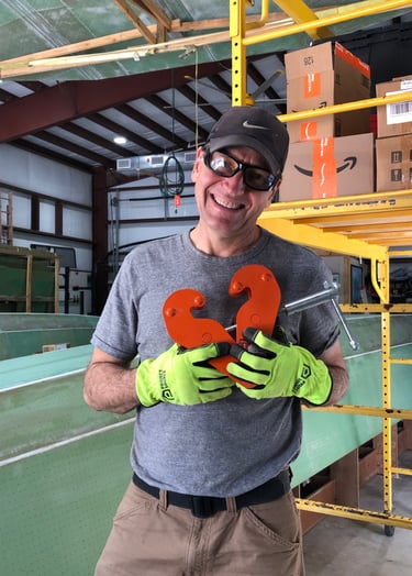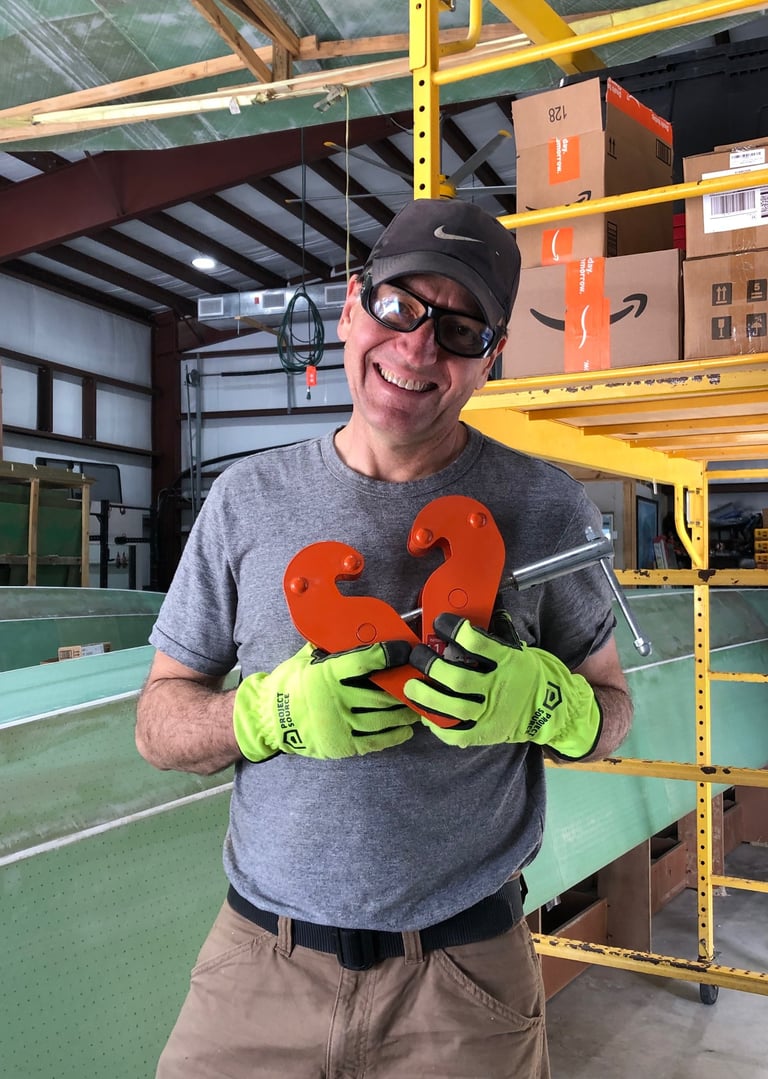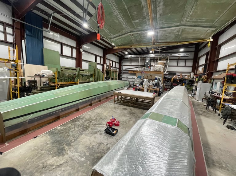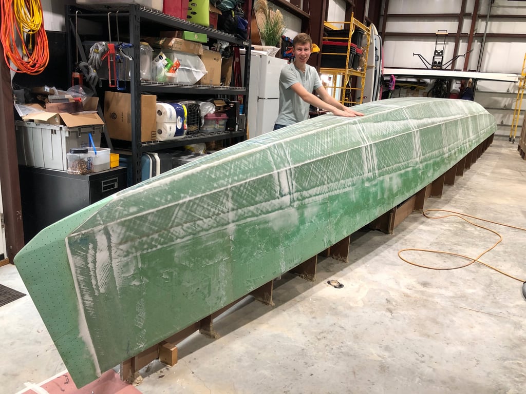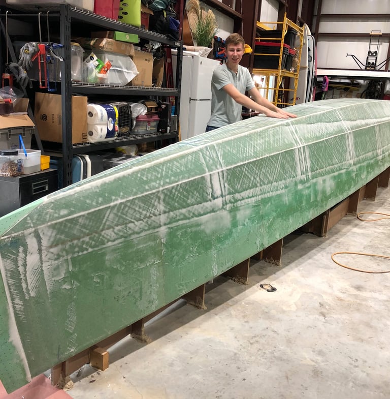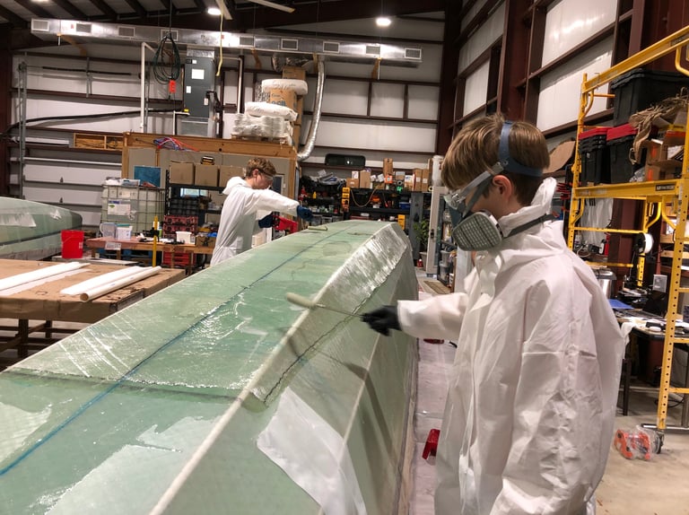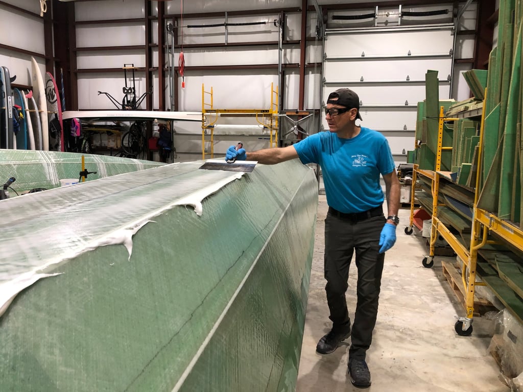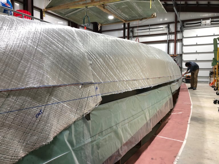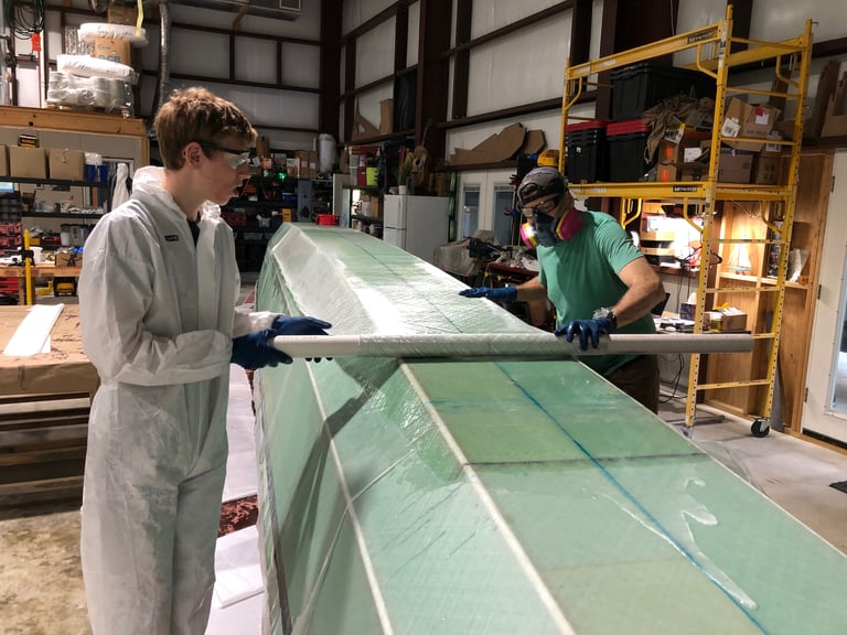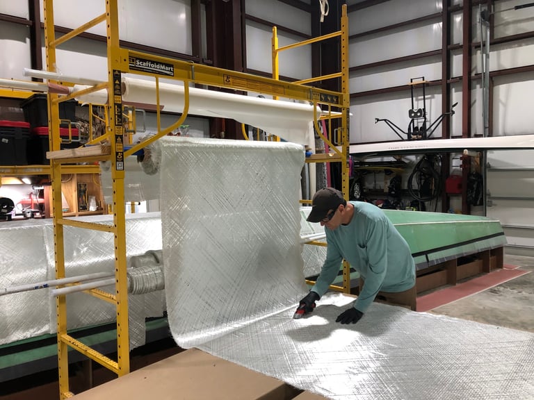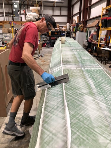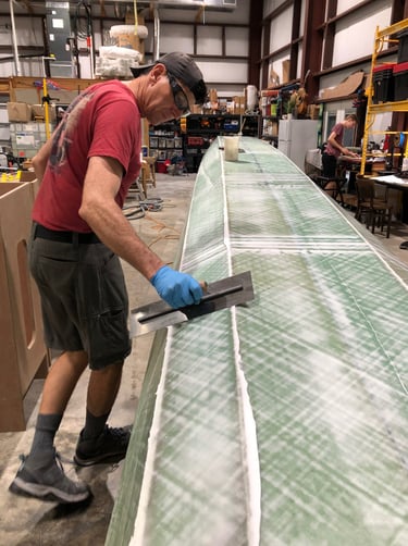 After allowing the first two layers of fiberglass + epoxy per hull to cure—but while still green—we pulled off the peel ply and then applied a third layer of fiberglass to what will be the bottom of the hulls.