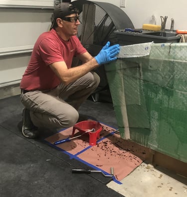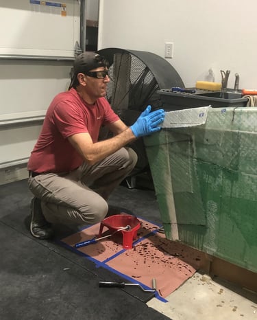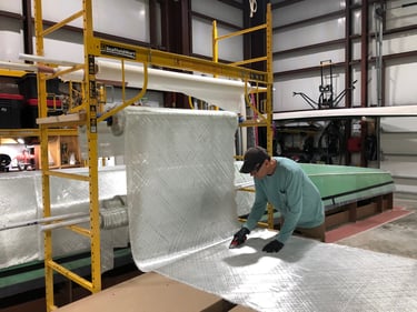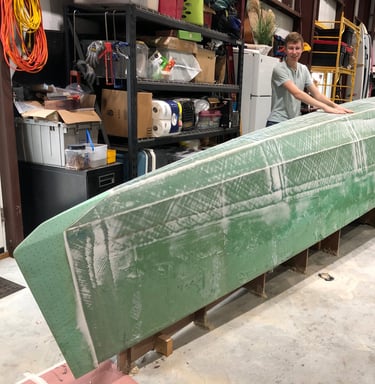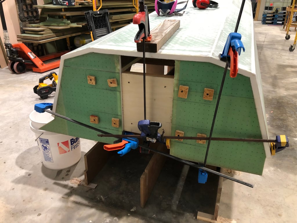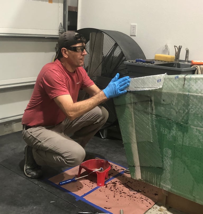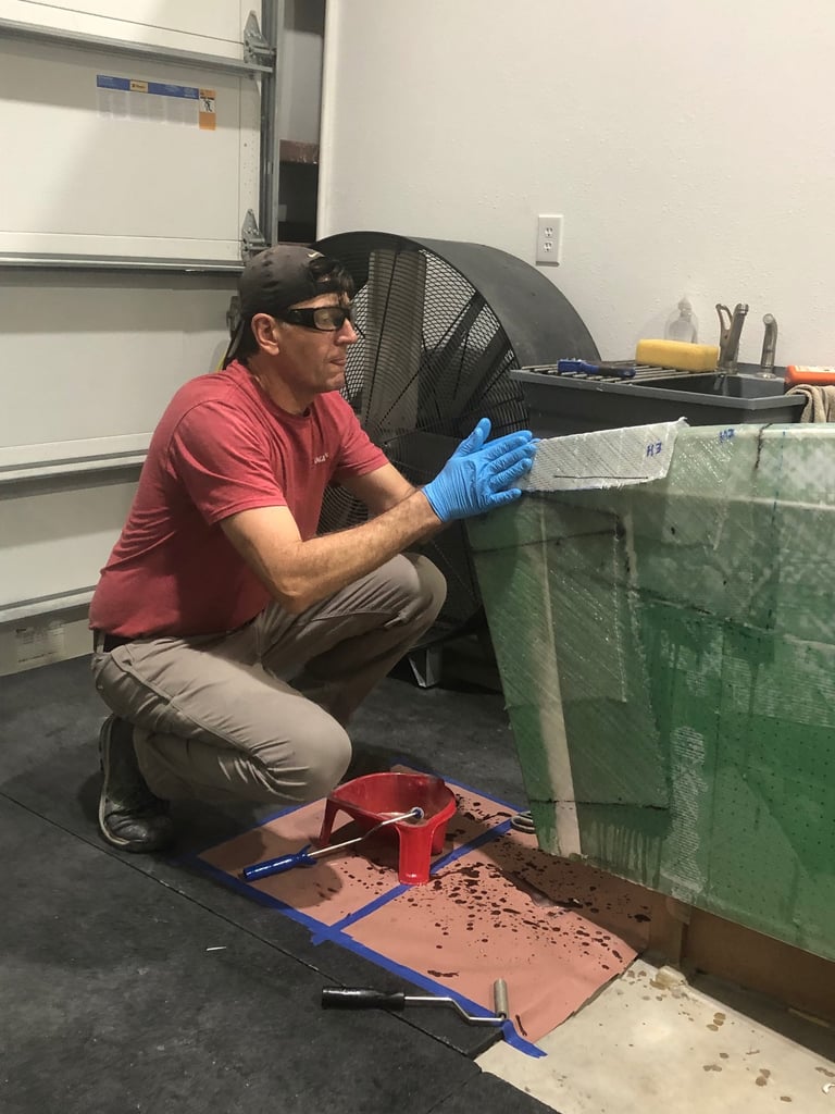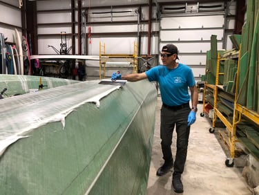 We laid out sheets of fiberglass and used lasers to identify where the water line would be, cutting the sheets to size based on the plans’ specifications.