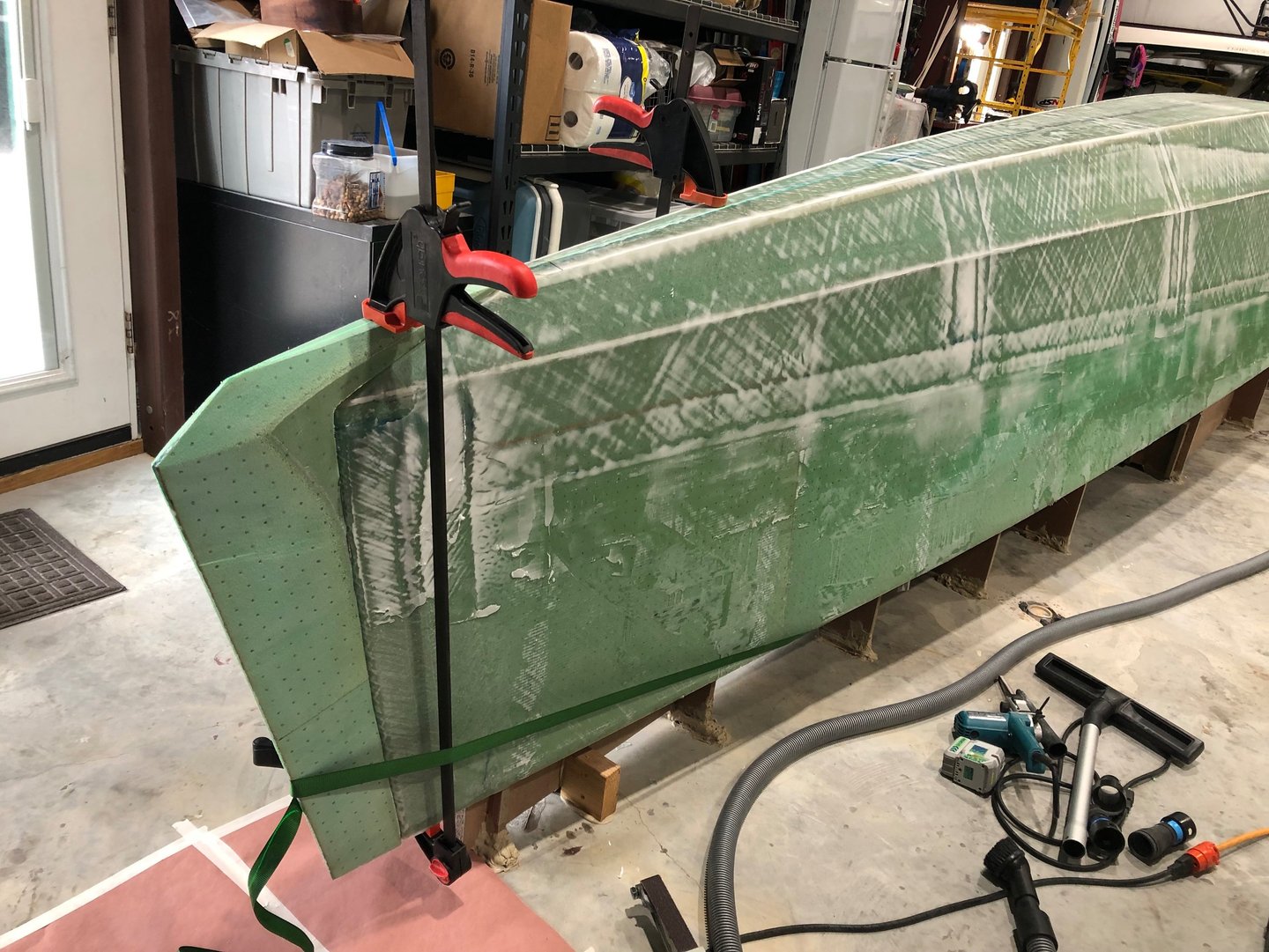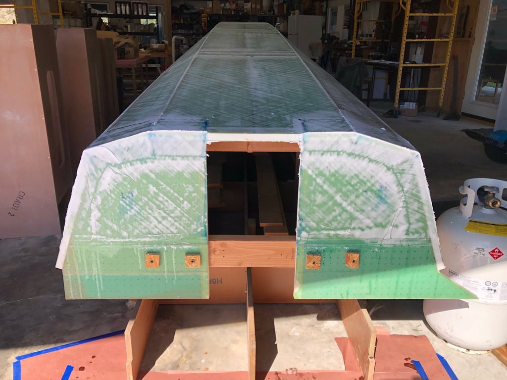 We draped the pre-cut fiberglass sheets over the starboard hull, ready to lay them out and epoxy into place over the port hull on the next full day.