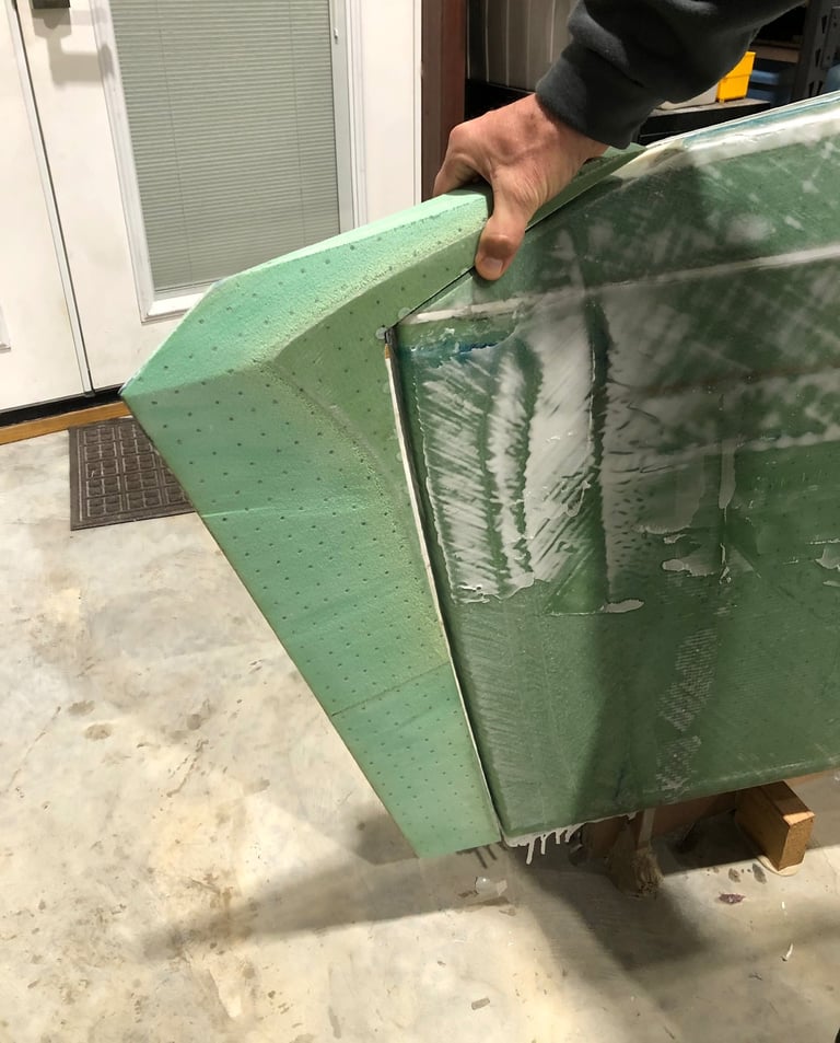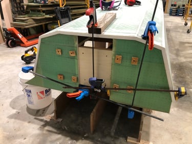 Nick finalized the proper shape to match the existing chines, and then fiberglassed the nose to the rest of the hull.
