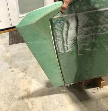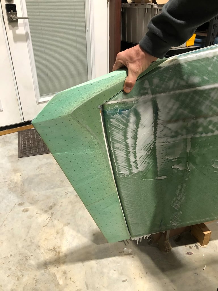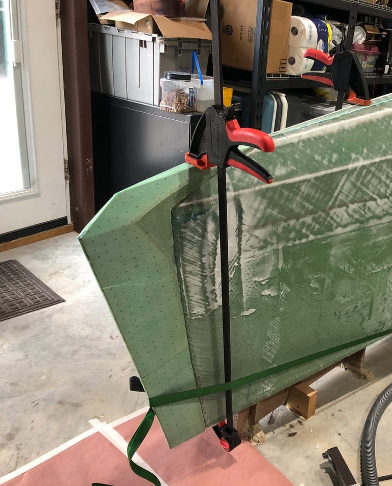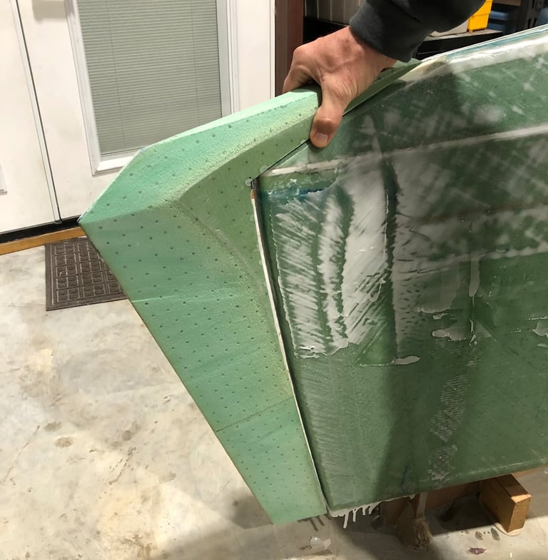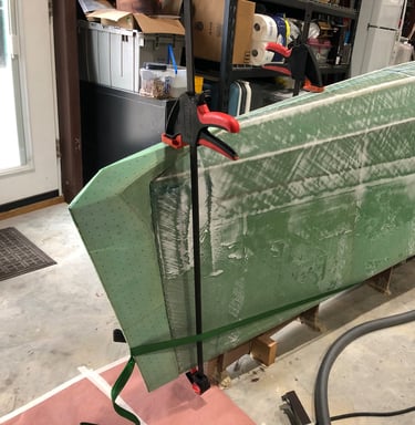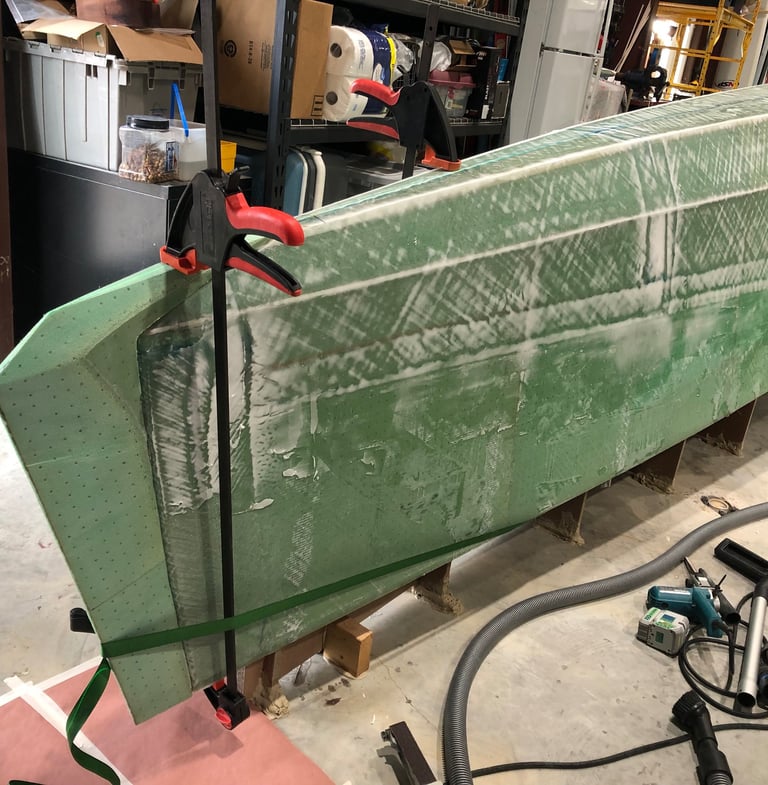 In between fairing and sanding, Nick started working on the nose of each hull, adding inches to the amount of caution we need to have every time we walk around both hulls. Roughly cut and shaped pieces were first epoxied to the bow.