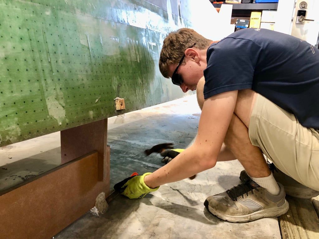 To turn the hulls, the first thing we had to do was break them and their supports loose from the concrete floor.