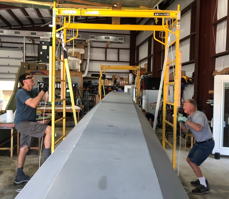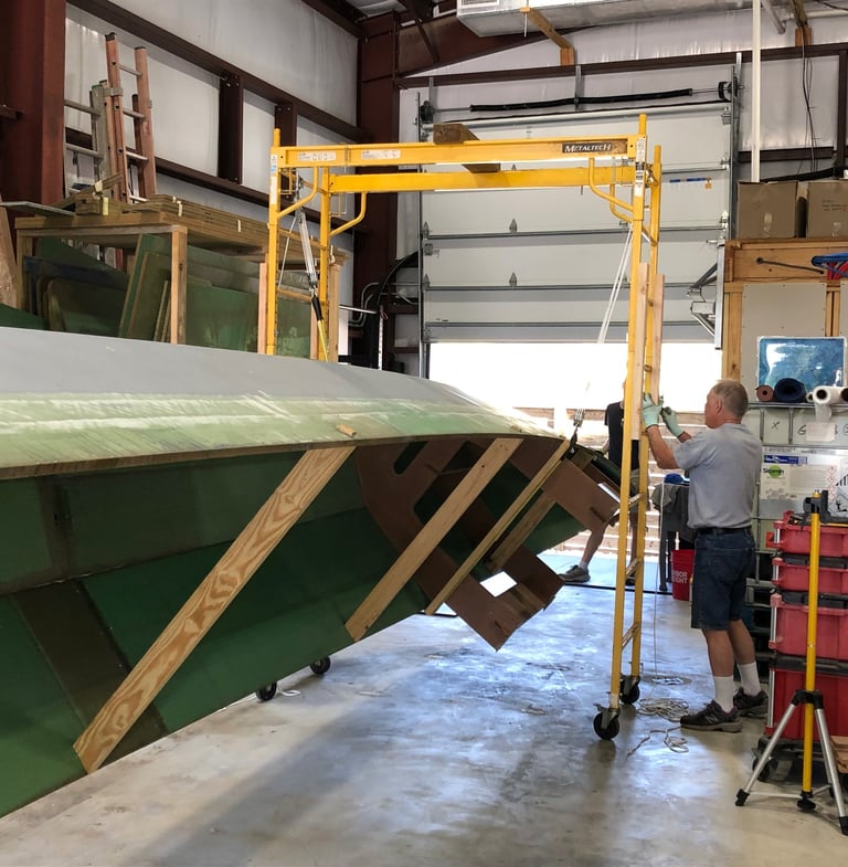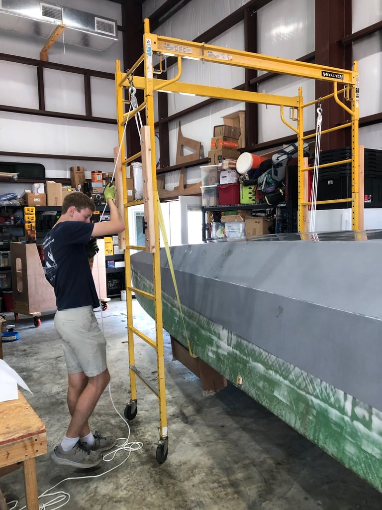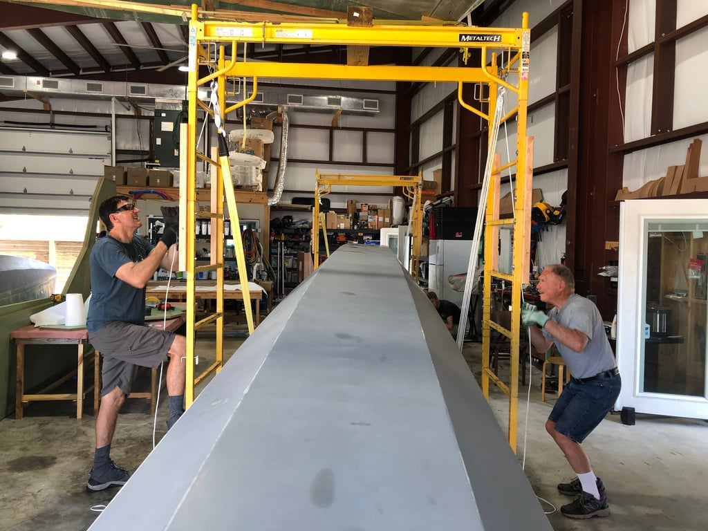 Starting with the starboard hull, we straddled each end with a scaffold (crane) and ran a strap underneath. Using four people, one at each pulley, we hoisted the hull several feet off the floor, high enough to gingerly roll it over inside the straps.