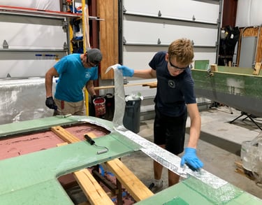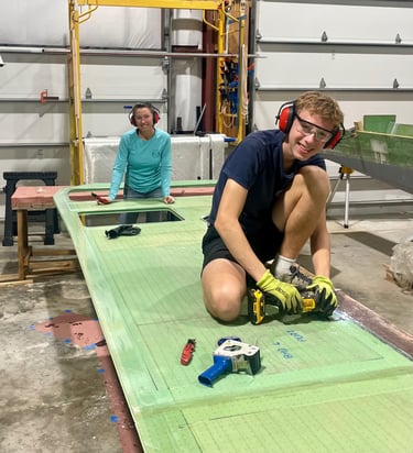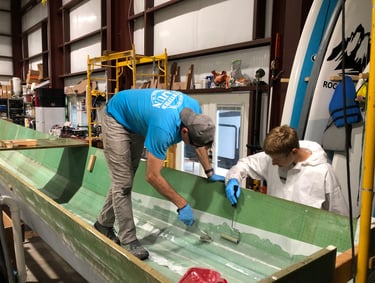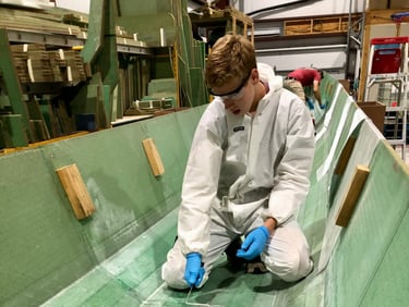 After the hulls were upright, we taped two layers of fiberglass along all the inside joints, then covered the fiberglass with peel ply to help soak up excess epoxy and give a consistent finish.