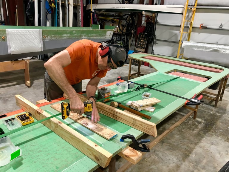 While utilizing the scaffold to hover our first bulkhead (BHD 4) in place, we glued it in. Then we did the same steps with the second bulkhead (BHD 5b), which is where Felicity stands today.