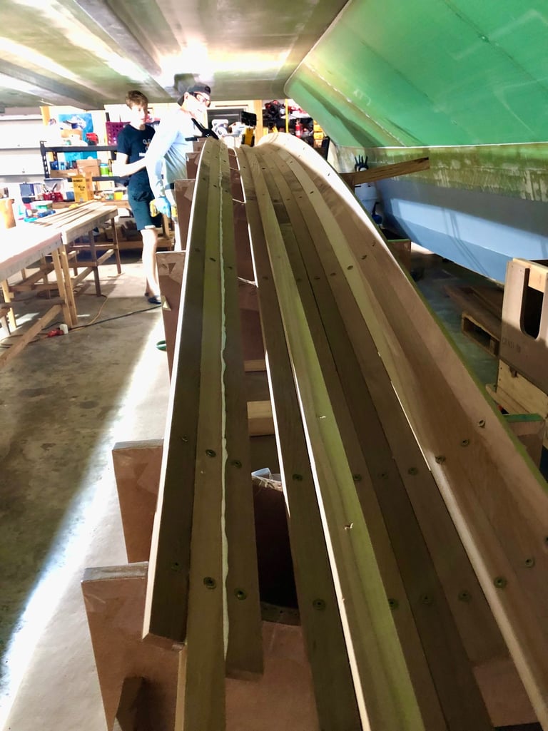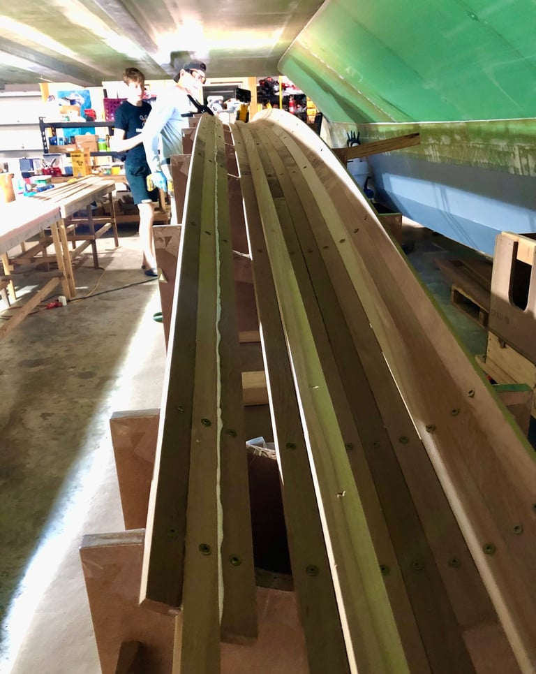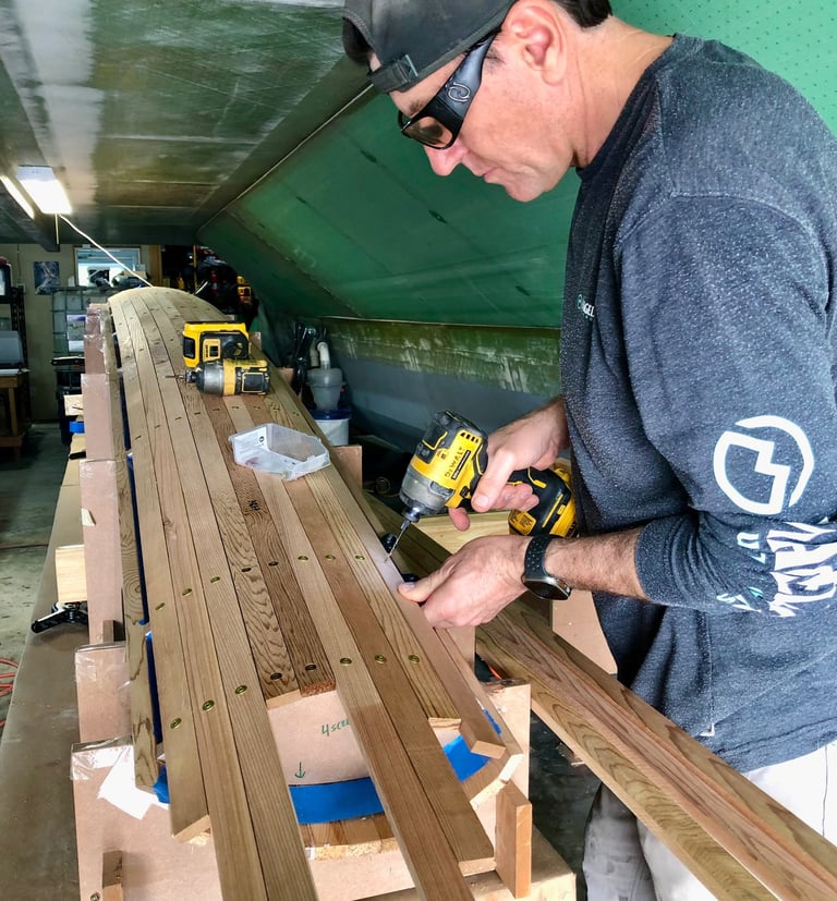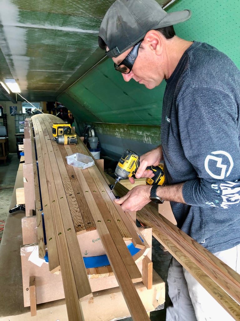 Then we placed the individual planks side by side on the mold, screwed them in, and epoxied them together over the mold to form the bottom half shape of the forebeam. After sanding it smooth, we put the other side together and repeated the process.