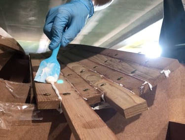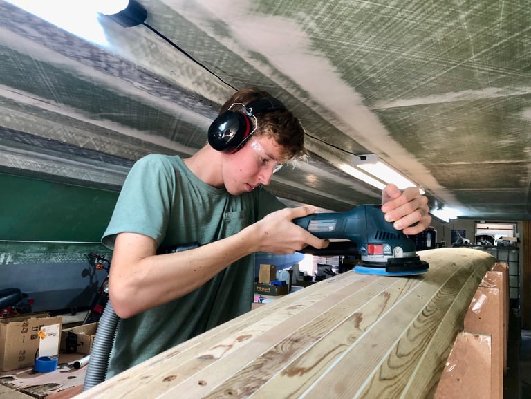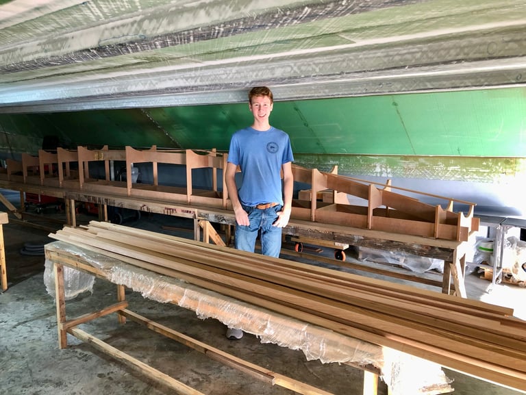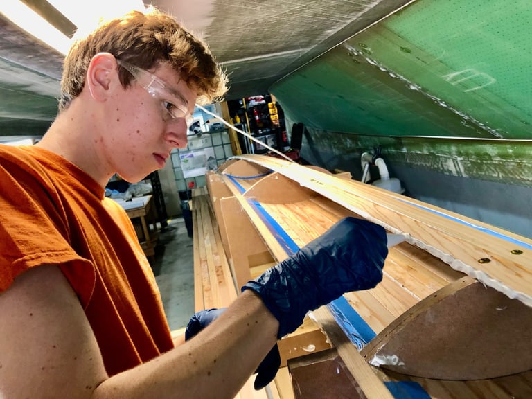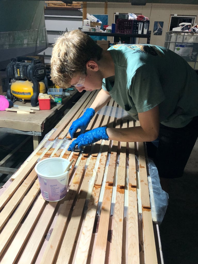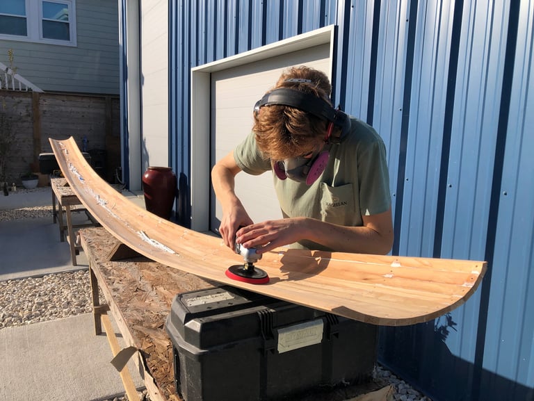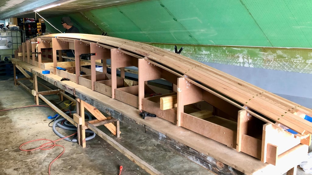 Then we placed the individual planks side by side on the mold, screwed them in, and epoxied them together over the mold to form the bottom half shape of the forebeam. After sanding it smooth, we put the other side together and repeated the process.