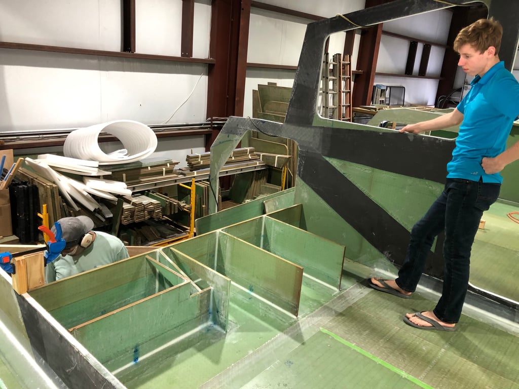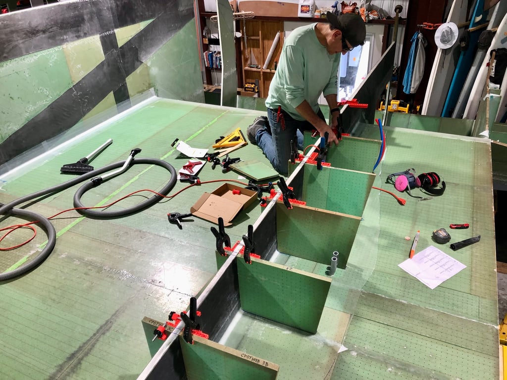 The next step for the forebeam is to install a vertical web in the middle and laminate each surface with multiple layers of carbon fiber, and then vacuum bag the whole thing. (For a later blog.)