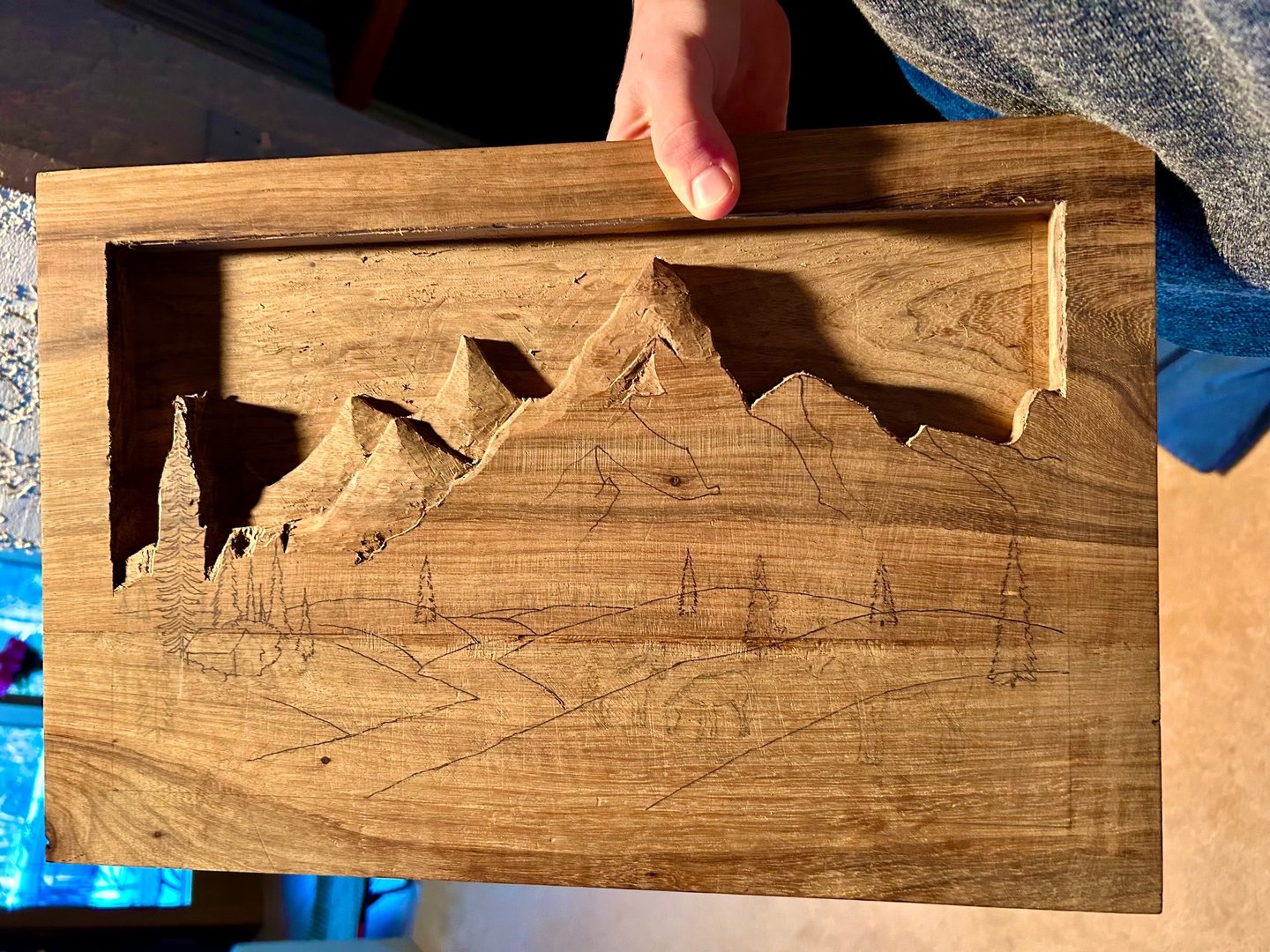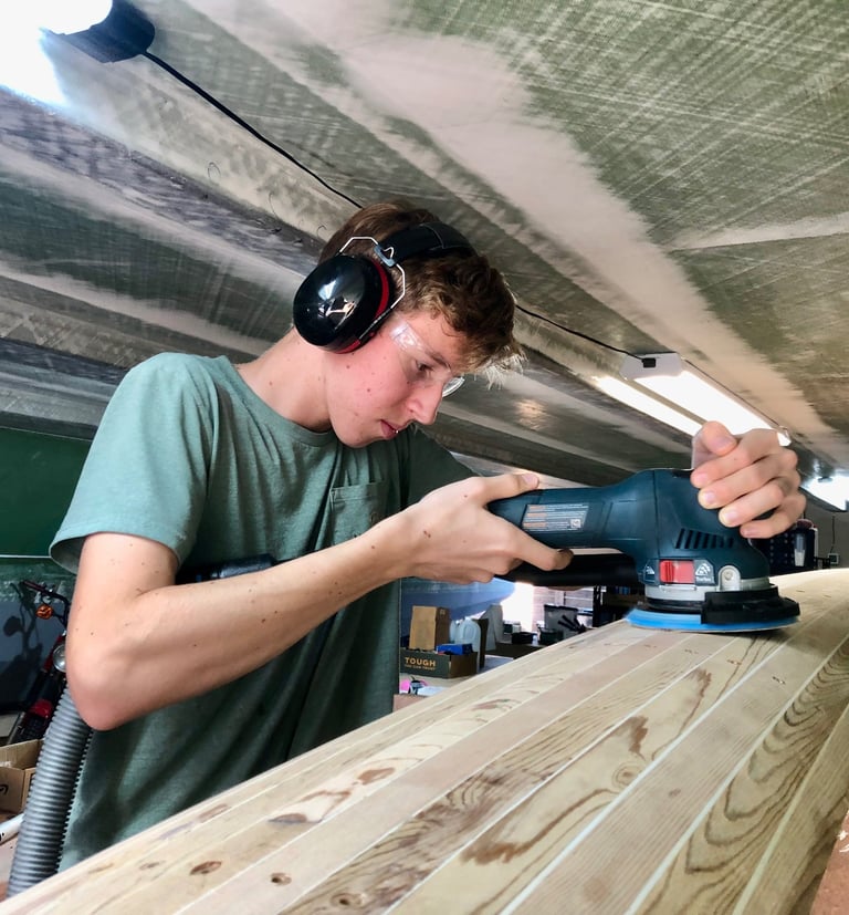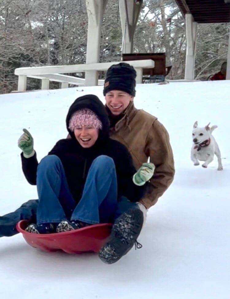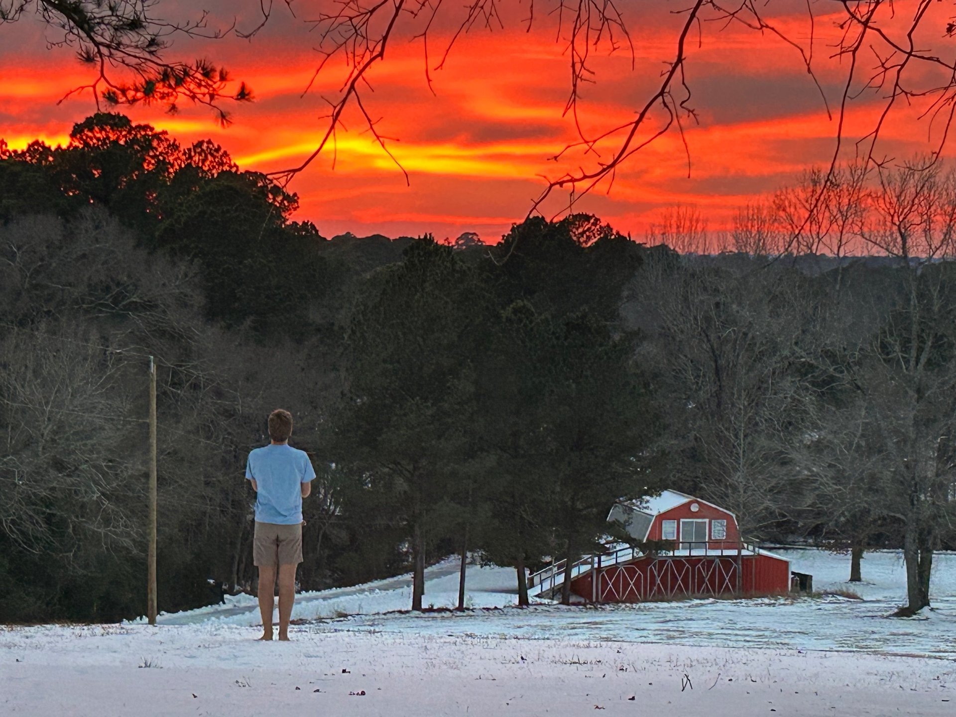 We later visited my parents during a time when we were forced to extend our stay due to freezing precipitation. Perfect planning, I’d say. My parents kept us engaged with a sled and warmed by the fire. Mom was worried about running out of food since we couldn’t leave the driveway, but her “rations” turned out way fancier than my normal home-cooked food. Tristan spent a lot of his time drawing and carving a mountain scene on my dad’s spare plank of exotic South American walnut. He also got to test drive my mom’s antique del Sol (before the ice days hit). Calvin drank in the last great sunset before our return to the daily grind of homeschool and boat building.